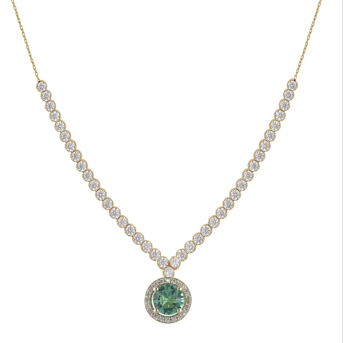 Κολιέ ροζέτα σε κίτρινο χρυσό 14 καρατίων με Nano Paraiba η κεντρική πέτρα και με λευκές πετρες ζιργκόν οι υπόλοιπες