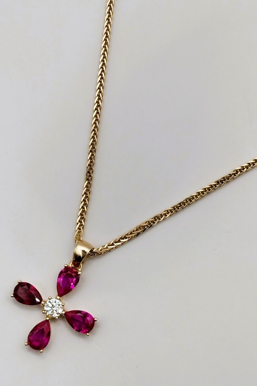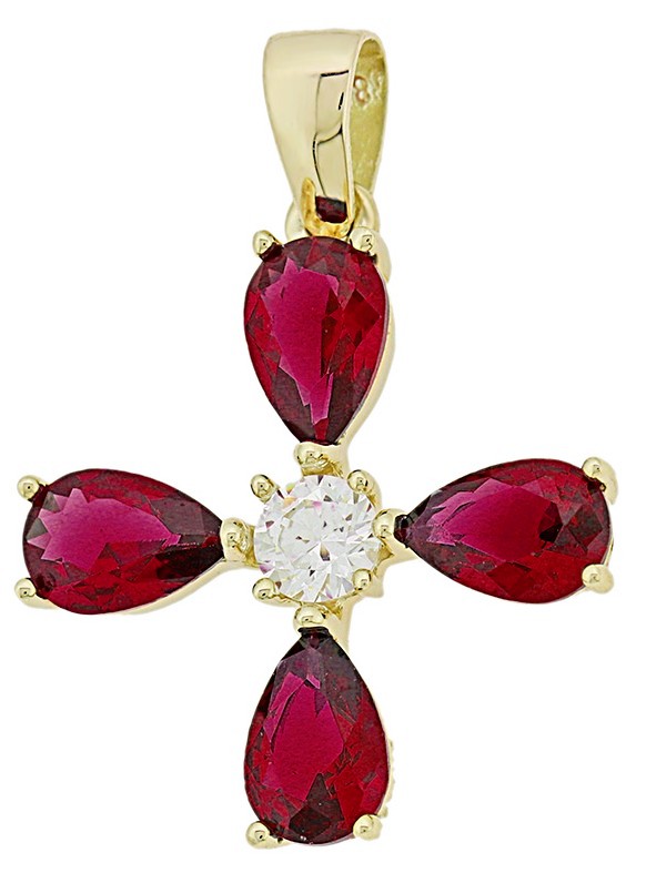 Ένας γυναικείος σταυρός από κίτρινο χρυσό 14 καρατίων με πέτρες ζιργκόν σε κόκκινο χρώμα ,ένα κόσμημα ιδανικό για τις βραδυνές σας εμφανίσεις αλλά και την καθημερινότητά σας.