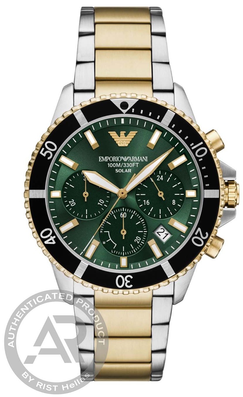 ΧαρακτηριστικαΜαρκα:Emporio ArmaniΦυλο:ΑνδρικάΤυπος:Outdoor, ΣπορΣχημα ρολογιου:ΣτρογγυλόΔιαμετρος κασας:Large (43mm-46mm), 43mmΠαχος κασας:13mmΥλικο Κασας:Ανοξείδωτο ΑτσάλιΚαντραν:ΠράσινοΚρυσταλλο:ΟρυκτόΑδιαβροχο:10 Atm (Κατάλληλο για κολύμβηση )Μηχανισμος:ΗλιακόςΛειτουργιες:Ημερομηνία,Χρονογράφος δευτερολέπτου.Τυπος δεσιματος:ΜπρασελέΥλικο δεσιματος:Ανοξείδωτο ατσάλιΧρωμα δεσιματος:ΔίχρωμοΚουμπωμα:ΑσφαλείαςΕγγυηση:2 ετών επίσημης αντιπροσωπείας