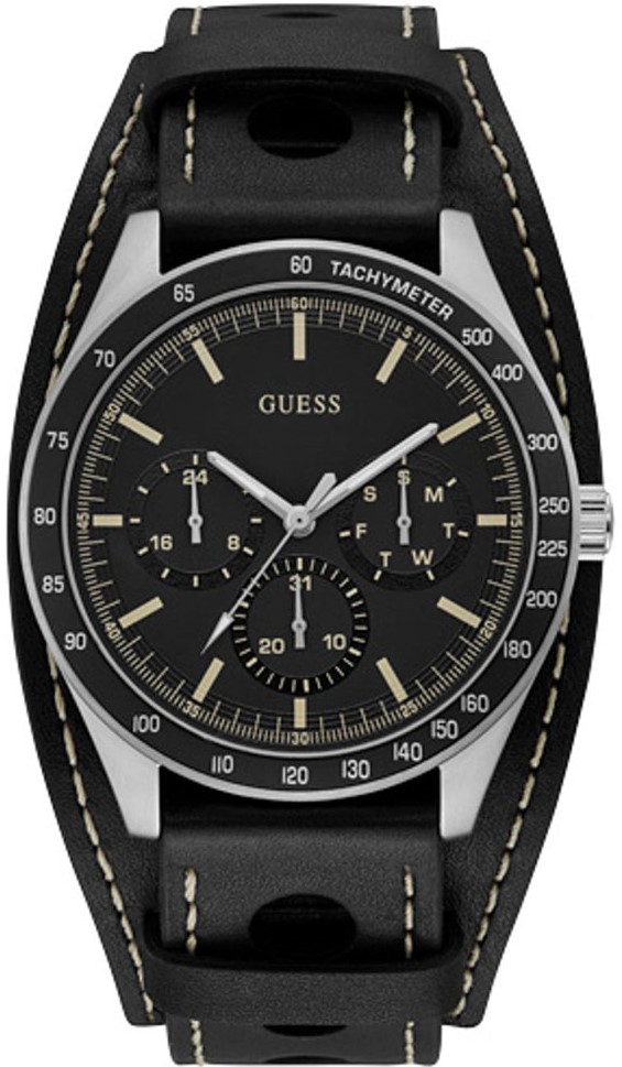 FeaturesBrand:GuessGender:Μens, UnisexType:ClassicDial type:RoundCase size:Large (43mm-46mm), 44mmDail:BlackCrystal:MineralFunctions:24 hour display, Day, Date, TimeStrap type:StrapStrap material:LeatherStrap color:BrownClasp type:Strap Buckle