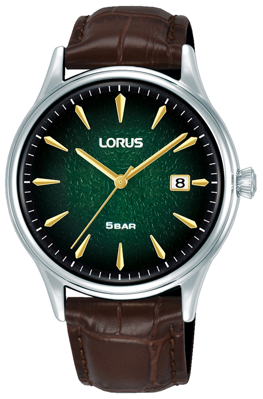 FeaturesBrand:LorusGender:ΜensType:ClassicDial type:RoundCase size:Medium (36mm - 42mm), 40mmCase thickness:9.7mmDail:GreenCrystal:MineralWater resistance:5 Atm (Splashing Water)Functions:DateStrap type:StrapStrap material:LeatherStrap color:BrownClasp type:Strap BuckleCollection:Classic
