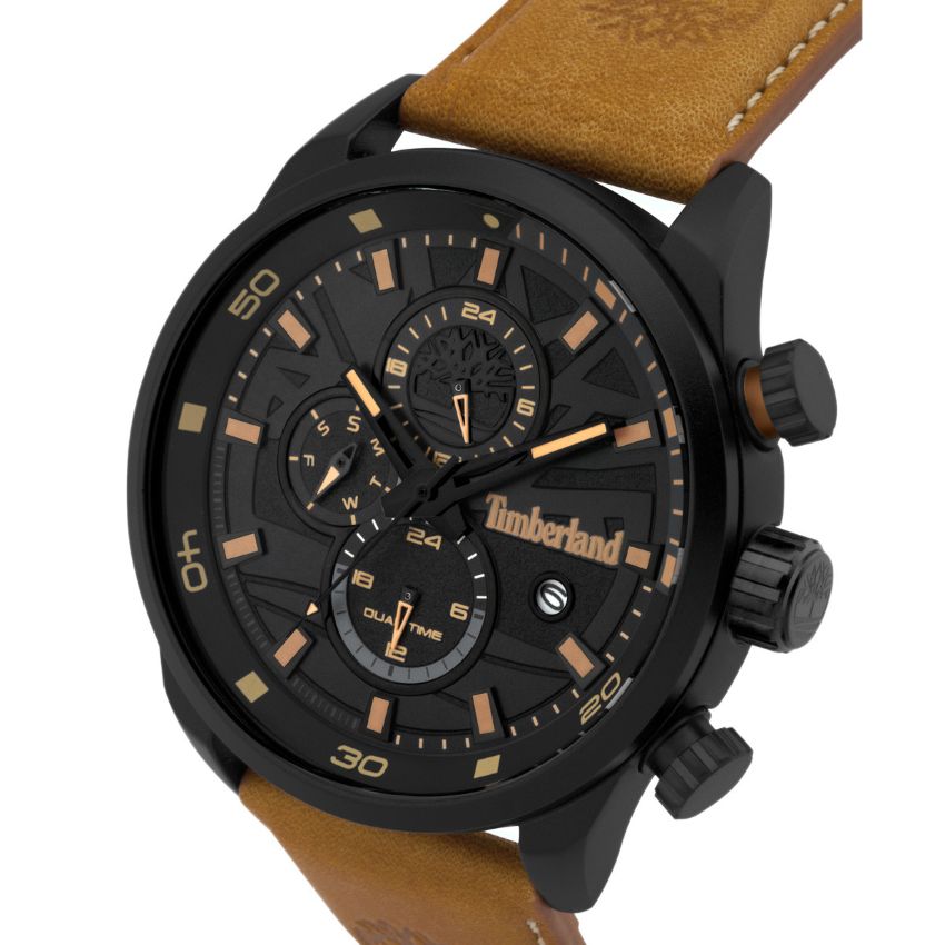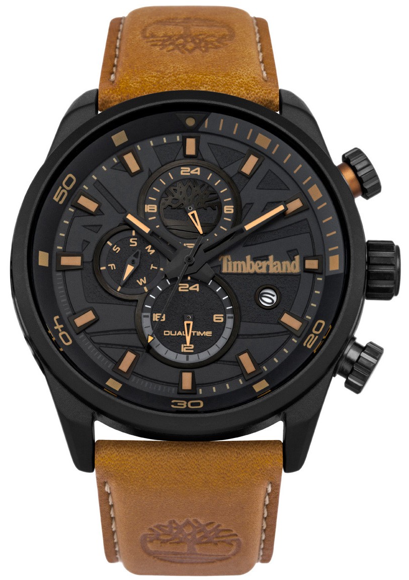 FeaturesBrand:TimberlandGender:ΜensType:ClassicDial type:RoundCase size:Large (43mm-46mm), 46mmCase thickness:12,7mmDail:BlackCrystal:MineralWater resistance:5 Atm (Splashing Water)Functions:Day,Date., Time display on a 24-hour basis, second hour display on a 24-hour basisStrap type:StrapStrap material:LeatherStrap color:BrownClasp type:Strap BuckleCollection:Henniker II