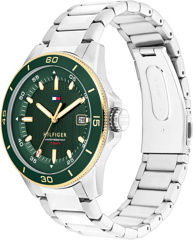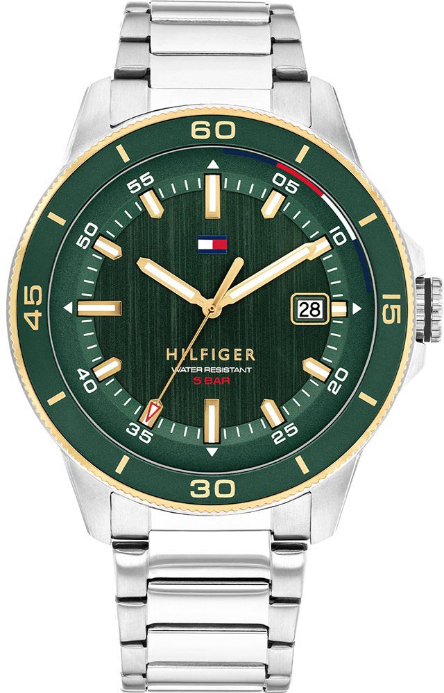 FeaturesBrand:Tommy HilfingerGender:ΜensDial type:RoundCase size:Large (43mm-46mm), 43mmCase thickness:11mmDail:GreenCrystal:MineralWater resistance:5 Atm (Splashing Water)Functions:DateCollection:Remy