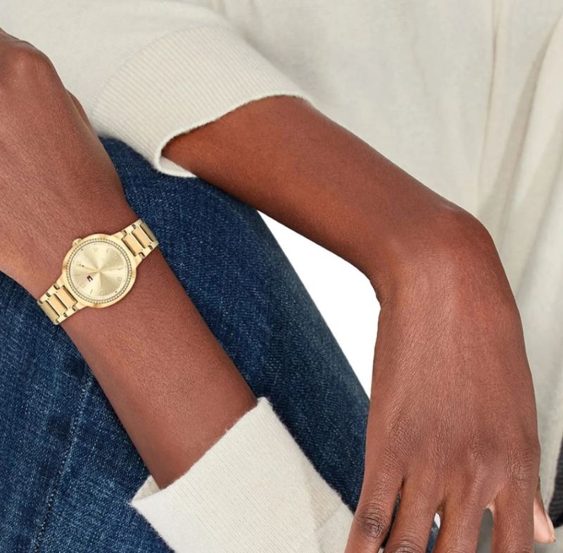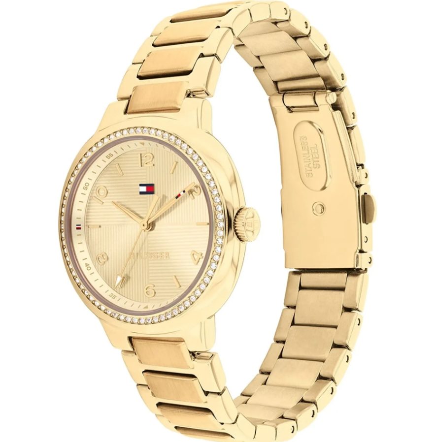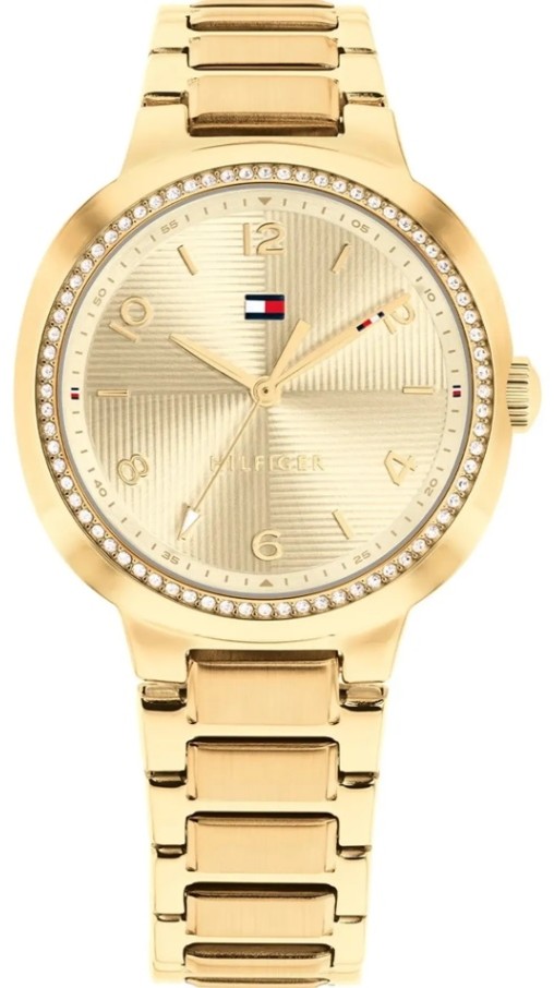 FeaturesBrand:Tommy HilfingerGender:LadiesDial type:RoundCase size:Small, -Case thickness:8.0mmDail:GoldCrystal:MineralStrap color:GoldStones:ZirconCollection:Savannah